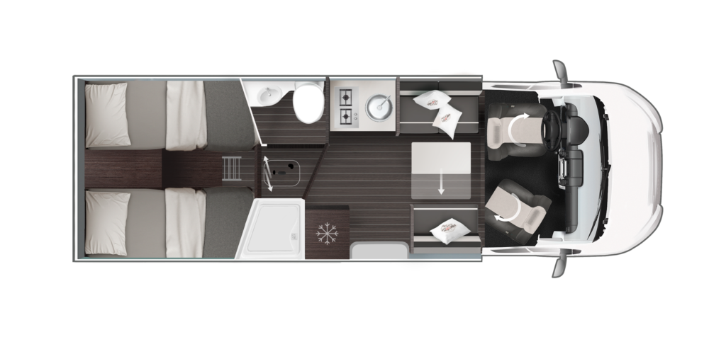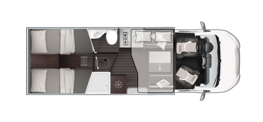La autocaravana perfilada para aquellos que buscan mucho espacio, áreas separadas y gran capacidad de almacenamiento. Dos camas individuales y un aseo independiente con ducha separada.